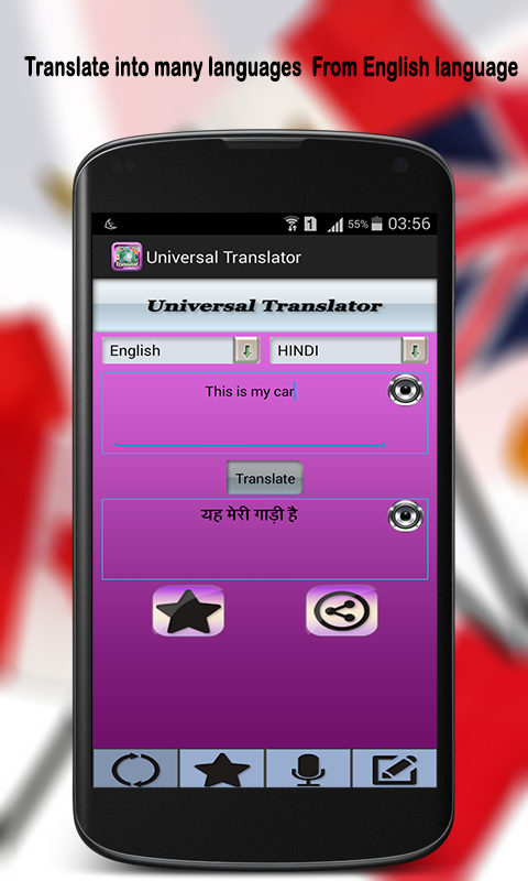 Universal Translator is Lightweight and free application that Translate English to more than 50 Languages. Speech to Text system is integrated so to help you in any language Vocabulary and pronunciation. You can save your Favorite difficult sentence to save your time.