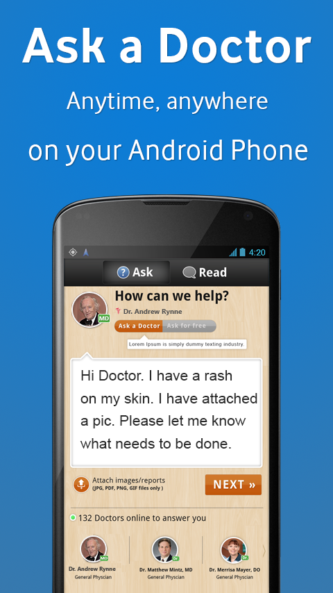 Instant answers from Doctors, 24x7. “Ask a Doctor” app allows you to write your health query, attach a picture or your latest lab report and post to doctors across the world in just a few taps. Your answer arrives in minutes thanks to our 15,000+ strong doctor network spread across geographies and time zones. What’s more? You can try it FREE. You also get FREE health tips from our doctors every now and then!